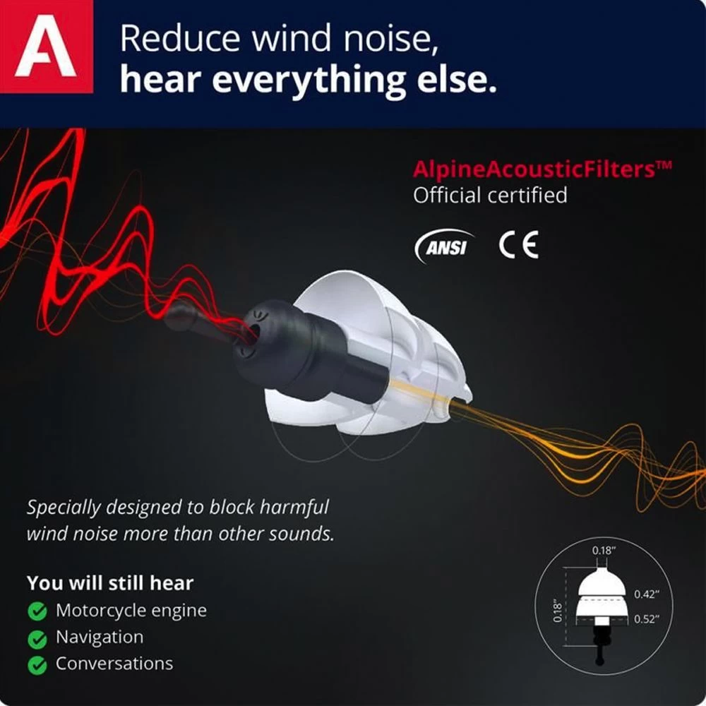 Traffic, motorcycle and communication systems remain sufficiently audible AlpineAcousticFilters™