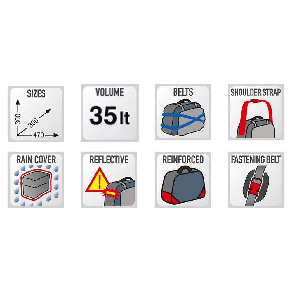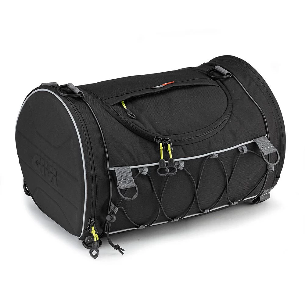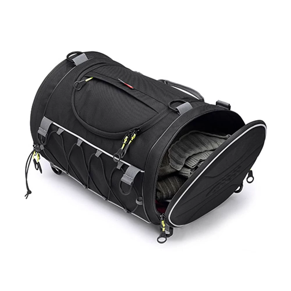 Double D-Ring fitting system with straps on the front and the side of the bag, with a central safety strap on the base, for fitment under the seat or tail.