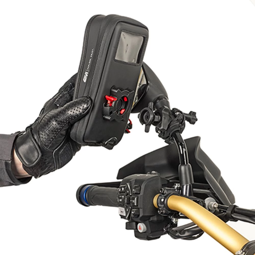 Thanks to the mounting system, designed and patented by GIVI, to attach and remove the smartphone holder is extremely simple and fast, taking only a matter of seconds. Loosening the handle on the mounting support can adjust the position of the smartphone holder according to the rider’s specific requirements, at any time and without the need for any tools.