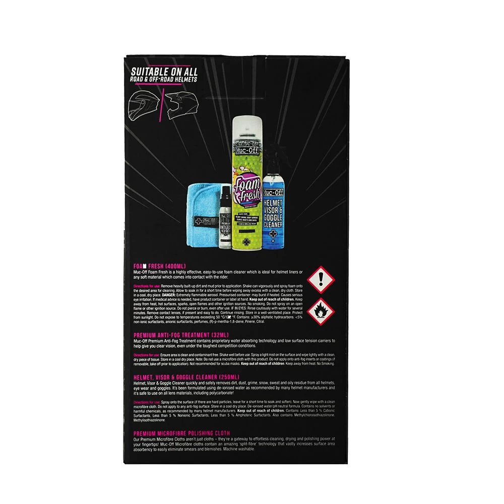 Foam Fresh, Visor Cleaner, Premium Anti-Fog Treatment and a Micro Fibre Cloth – all the essentials a rider needs to keep their helmet in top condition throughout the season.