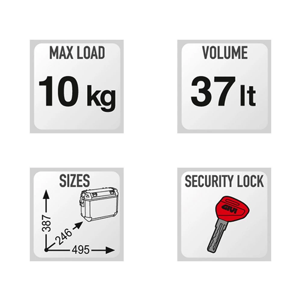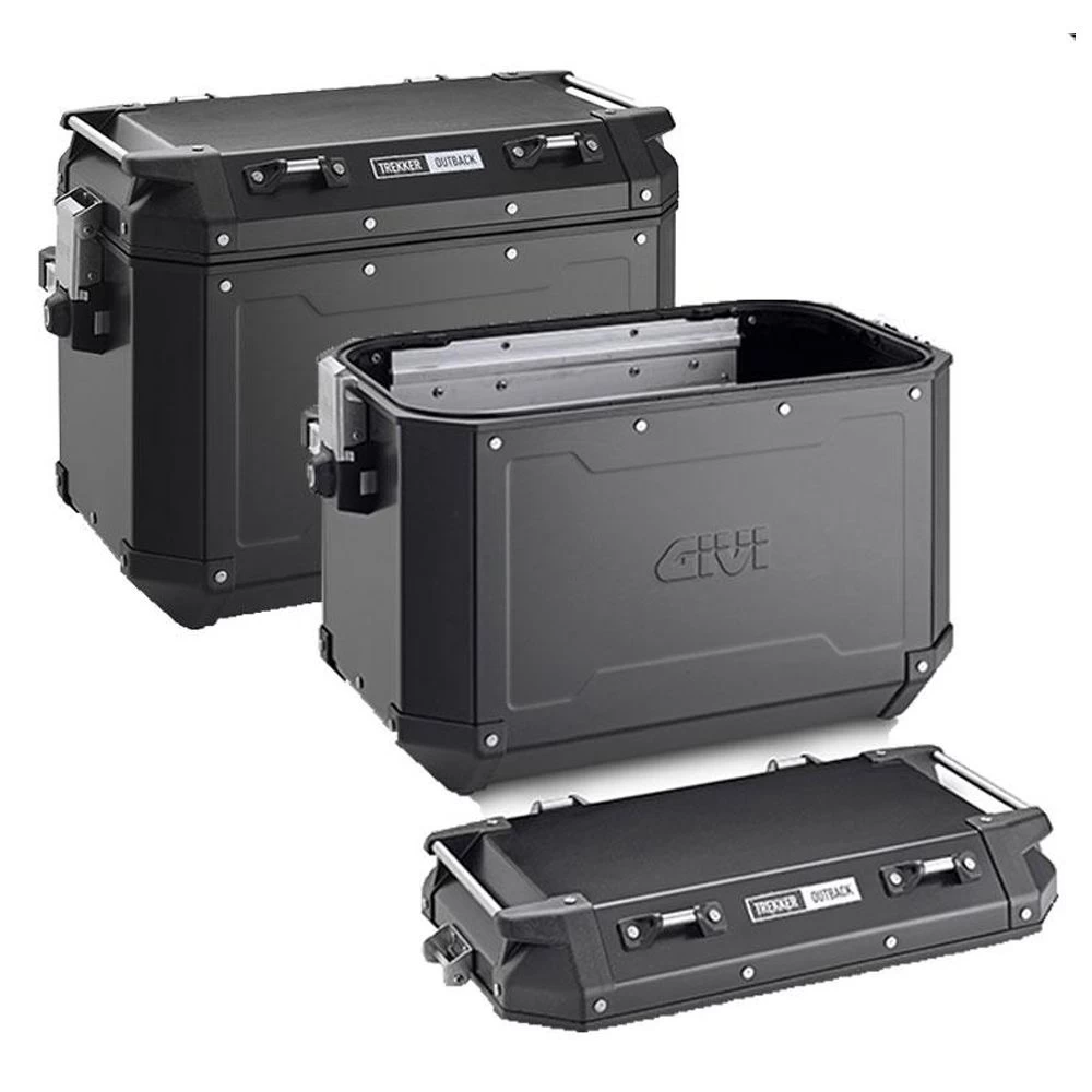 Supplied as a pair of side-cases (48ltr left and 37ltr right) supplied with matching lock cylinders plus a third matching lock cylinder to be mounted in a suitable separate top-case