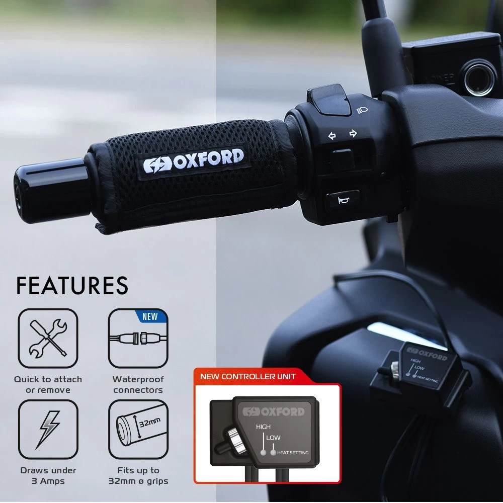 Weatherproof heated overgrips with two heat settings and featuring a new easy use controller unit with waterproof connectors.